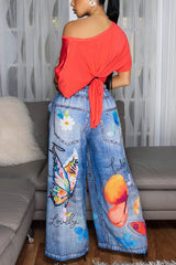 Butterfly Print Casual Elastic Waist Pocket Faux Denim Straight-Leg Pants