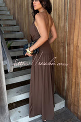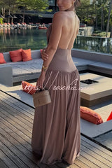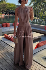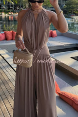 Lightweight Chic Metal Ring Drape Cowl Halter Neck Bodysuit and Elastic Waist Wide Leg Pants Set
