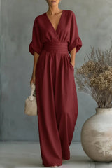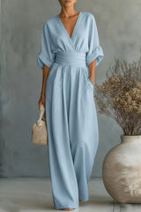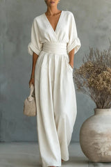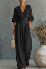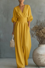 Solid Color V-neck Fitted Waist Pocket Casual Wide-leg Jumpsuit