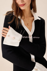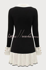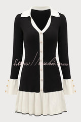 Stylish Color-blocked Long-sleeved Button-decorated Knitted Mini Dress
