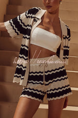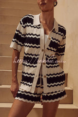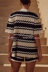 Stylish Color-blocked Striped Loose-fitting Short-sleeved Top and Elastic Waist Casual Shorts Knitted Cover-up Set
